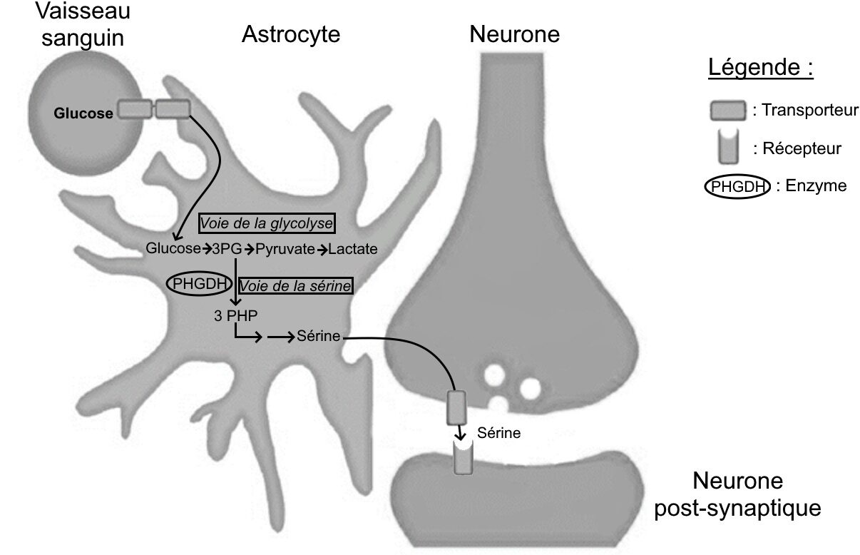 Les astrocytes sont des cellules gliales assurant un rôle nutritif pour les neurones cérébraux. Dans ces cellules, la sérine est produite à partir de la voie de la glycolyse grâce à l’action d’une enzyme, la PHGDH. Elle est ensuite exportée vers les neurones puis libérée dans la fente synaptique où elle agit sur le neurone post-synaptique.