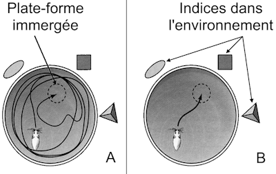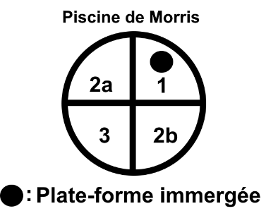 La souris est déposée toujours au même endroit dans la piscine et apprend à trouver la plate-forme immergée et non visible, grâce à des repères présents dans la salle où est réalisée l’expérience.
