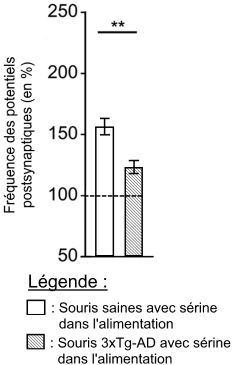 Dans cette expérience, on mesure la fréquence des potentiels post-synaptiques dans l’hippocampe chez des souris sauvages saines et des souris mutantes 3xTg-AD, après administration de sérine.