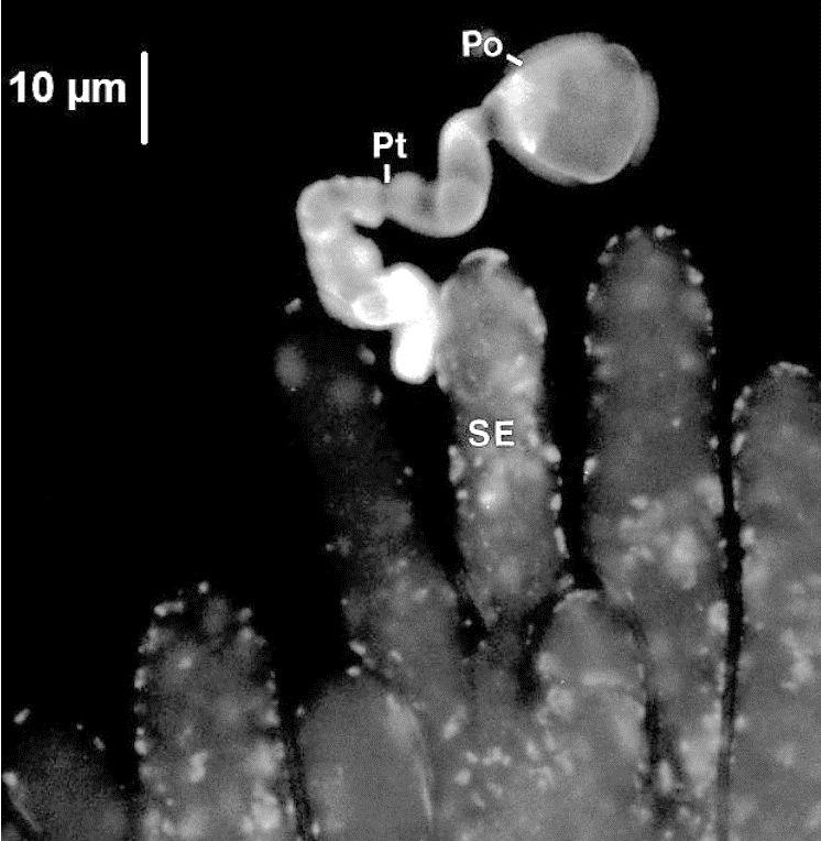 L’image, réalisée en microscopie à fluorescence, montre que l’extension (Pt) du grain de pollen (Po) est incapable de franchir la paroi des cellules épidermiques du stigmate (SE). Le grain de pollen et le stigmate appartiennent à la même plante.