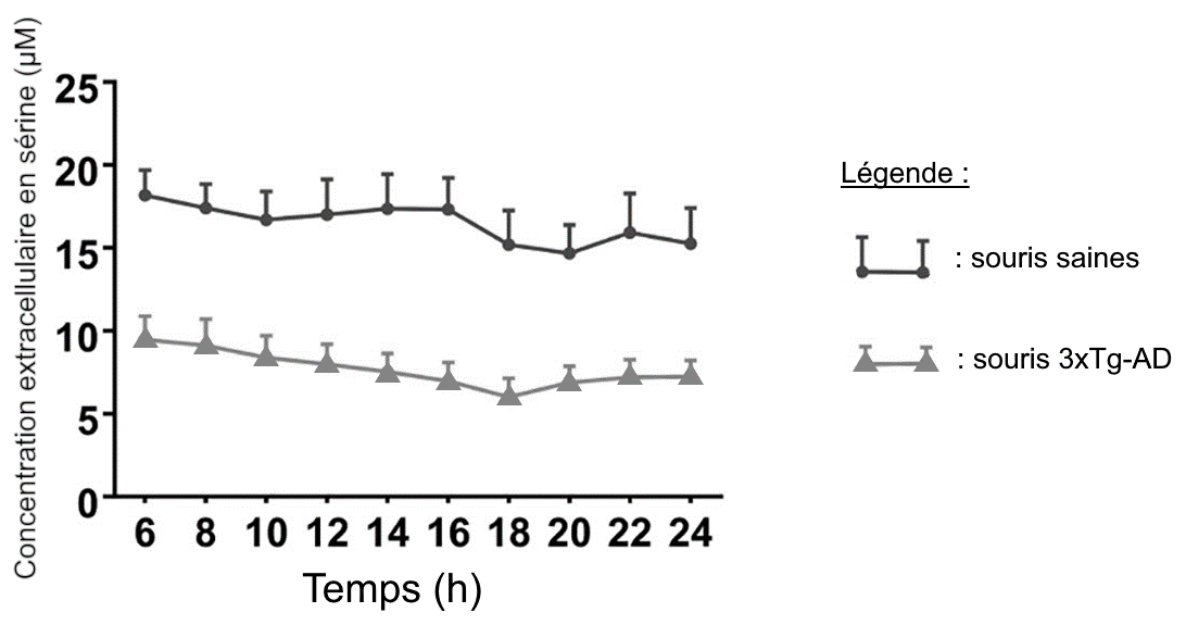 Document 3 : taux de sérine mesurés pendant 24 heures dans l’hippocampe de souris sauvages saines et de souris mutantes 3xTg-AD
