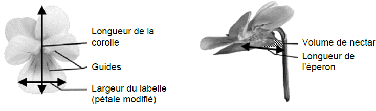 Document 1 : organisation de la fleur de la Pensée des champs et paramètres mesurés