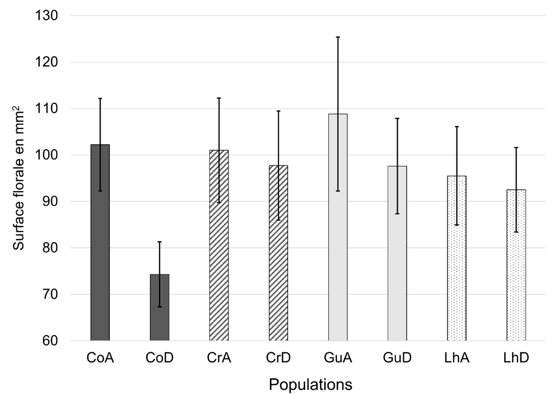 On évalue la surface florale et le nombre de guides floraux dans les populations ancestrales et descendantes au sein des différentes populations (Co, Cr, Gu et Lh).
