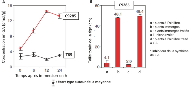 A. On mesure la concentration en GA au niveau des entre-nœuds de plusieurs plants de riz de chaque variété, T65 et C9285, en fonction de leur durée d’immersion. Au temps t = 0, les plants sont entièrement recouverts d’eau.