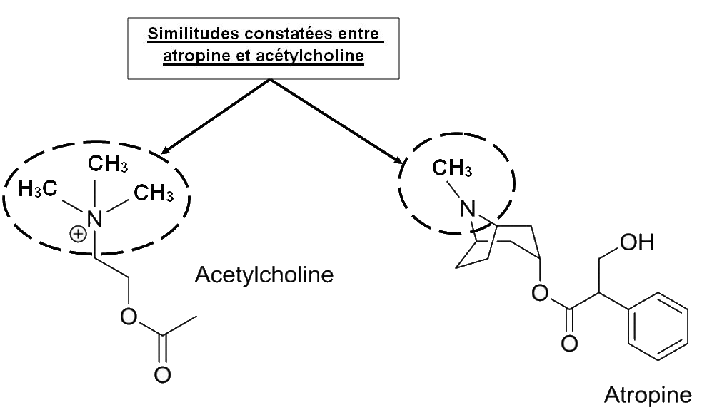 Une molécule qui présente des similitudes suffisantes avec l’acétylcholine peut se fixer à son récepteur et entrainer le même effet que l’acétylcholine. On parle de molécule agoniste. Si les similitudes sont présentes mais insuffisantes, alors la molécule peut se fixer au récepteur de l’acétylcholine mais bloque son effet. On parle de molécule antagoniste.